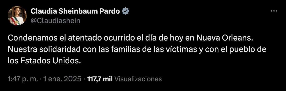 “Condenamos el atentado ocurrido el día de hoy en Nueva Orleans. Nuestra solidaridad con las familias de las víctimas y con el pueblo de los Estados Unidos”, expuso la mandataria en un breve mensaje en X.