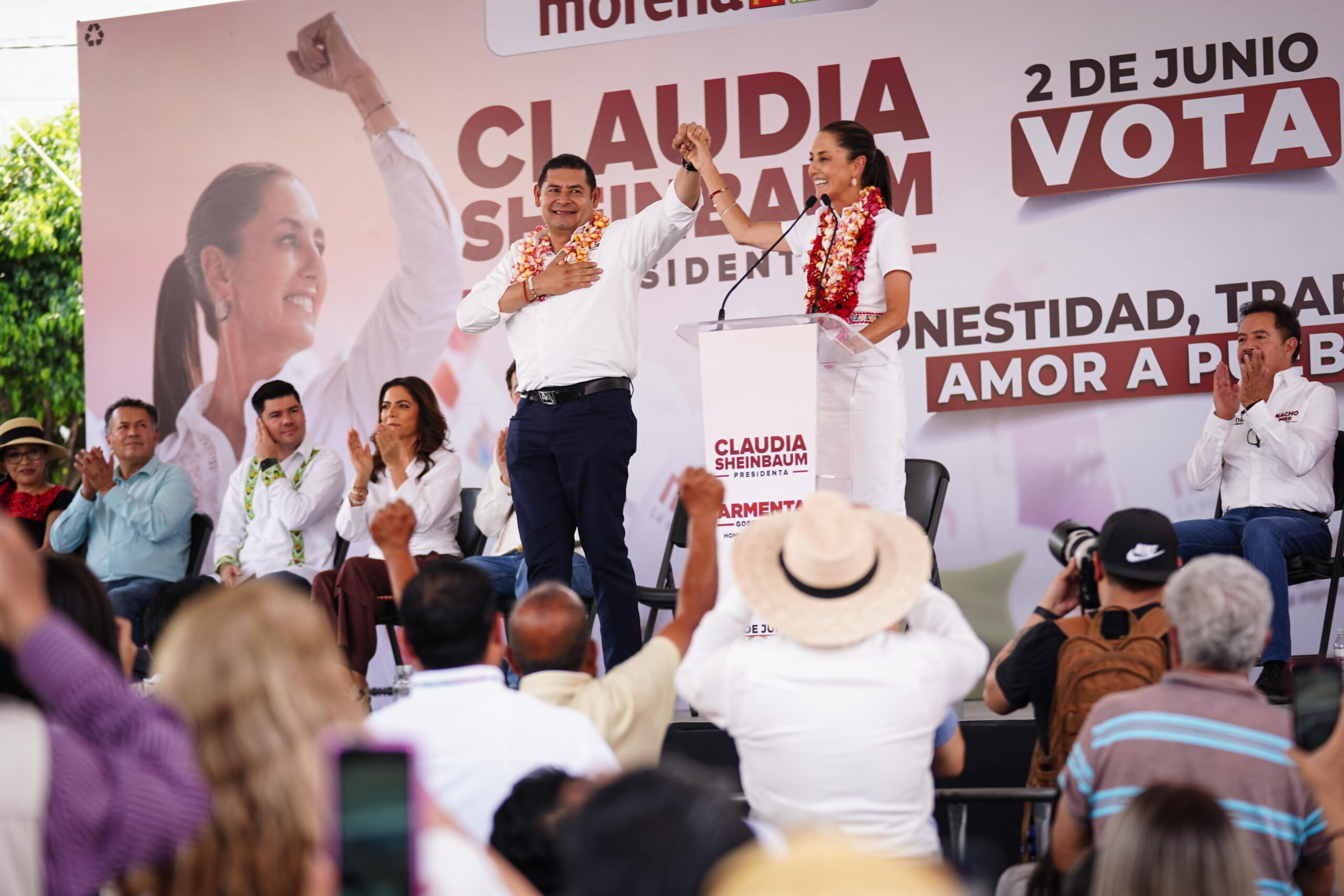 La candidata presidencial por la coalición conformada por los partidos Movimiento Regeneración Nacional (Morena), Partido del Trabajo (PT) y Partido Verde Ecologista de México (PVEM), visitó los estados de Puebla y de Morelos en los mantuvo un encuentro con los y las candidatas oficialistas de Chiapas, Eduardo Ramírez; de Veracruz, Rocío Nahle; de Puebla, Alejandro Armenta; y de Morelos, Margarita González Saravia.