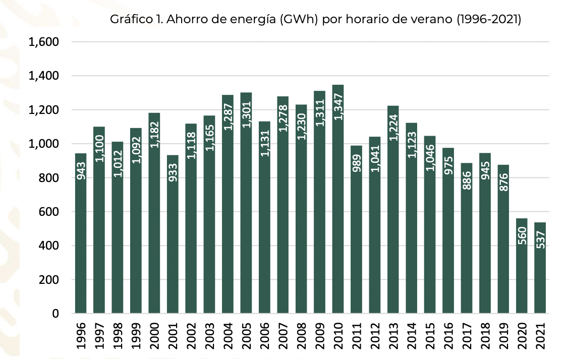 “En 2021, el consumo nacional fue de 327,000 Gw/h y el ahorro por el horario de verano fue de 537 Gigawatts-hora, lo que equivale a 0.16% del consumo nacional y un ahorro de 1,138 millones de pesos”, indica el “Análisis del Horario de Verano”, fechado el 5 de abril de este año.