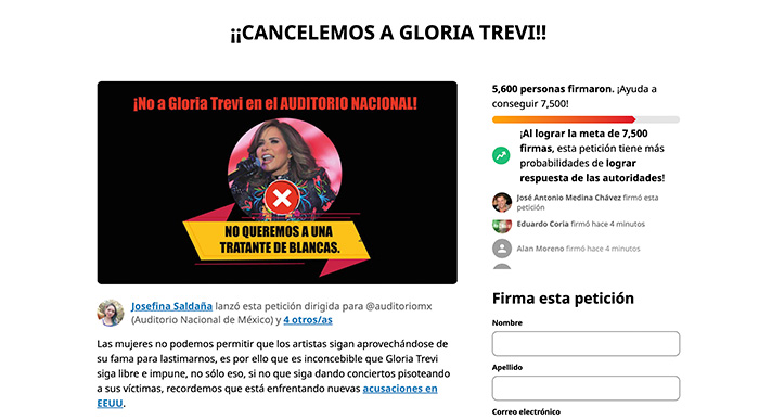 La petición fue presentada por Josefina Saldaña y hasta este 2 de marzo acumula más de 5 mil firmas a favor de que la cantante se mantenga alejada de los escenarios.