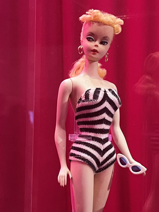 Se expone una primera edición de Barbie de 1959 con pelo rubio, ojos angulosos y vestida con un bañador blanco y negro, junto con modelos posteriores que representan diferentes razas, texturas de pelo y formas.