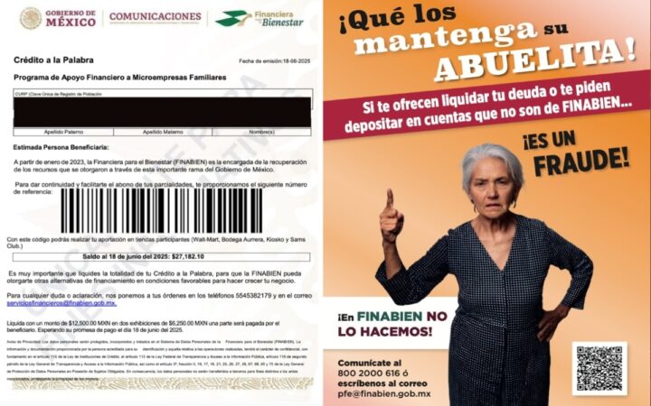 Desde el pasado 2 de junio, Financiera para el Bienestar (Finabien) ha emitido dos alertas por intentos de fraudes que ofrecen supuestos descuentos para liquidar los “Créditos a la Palabra” y “Tandas para el Bienestar” otorgados durante la pandemia de covid-19, pero los grupos delictivos mantienen su modus operandi para tratar de engañar y defraudar a personas mediante mensajes de Whatsapp y “boletas de pago” que falsifican documentos oficiales.