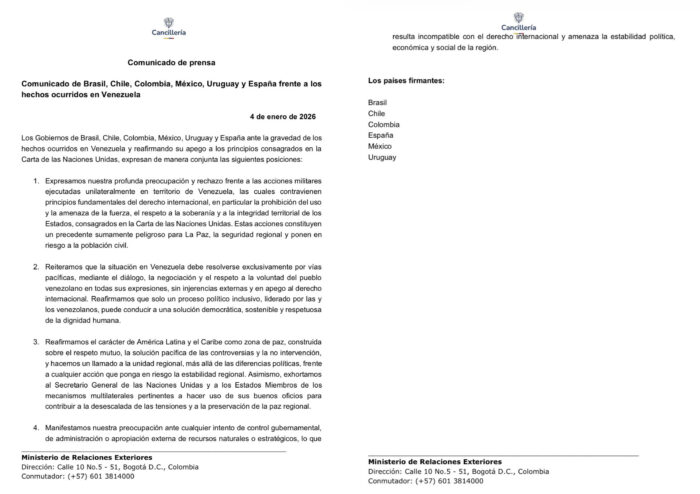 “Expresamos nuestra profunda preocupación y rechazo frente a las acciones militares ejecutadas unilateralmente en territorio de Venezuela, las cuales contravienen principios fundamentales del derecho internacional, en particular la prohibición del uso y la amenaza de la fuerza, el respeto a la soberanía y a la integridad territorial de los Estados”, expresaron los seis países en un comunicado.