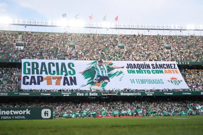 “Joaqui, Joaqui, Joaqui” u ‘Oh, capitán; oh, capitán” fueron las consigas más coreadas, amén de que antes del inicio se desplegó en una de las grada un tifo con una foto reproduciendo uno de sus certeros centros y el siguiente mensaje: “Joaquín Sánchez. Un mito con arte. 14 temporadas. Gracias, Cap17án”.