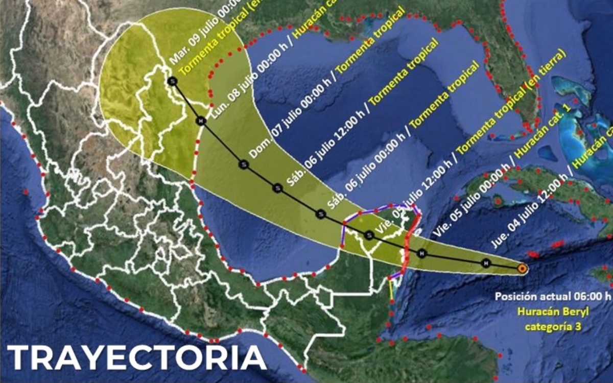Según adelantó la titular de Protección Civil, actualmente Beryl es de categoría 3 con vientos máximos de 195 kilómetros por hora, y se ubica a 705 km de Tulum, por donde se espera llegue al país.