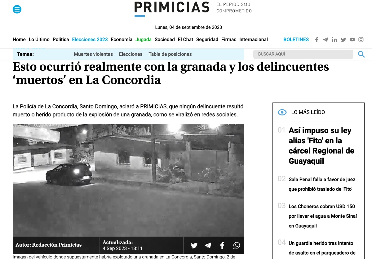 El atentado contra la vivienda que se ve en el video coincide con reportes del medio ecuatoriano La Hora que dan cuenta de una ola de atentados y ataques armados que dejaron un saldo de cinco personas muertas en La Concordia durante este fin de semana.