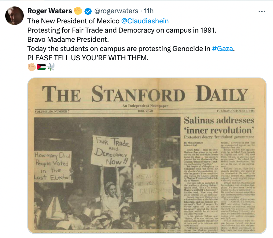 Roger Waters, quien es conocido por ser activista de diversas causas sociales, expresó a la virtual presidenta electa la situación que viven las y los estudiantes de dicho campus por protestar contra el genocidio que perpetra contra la sociedad civil de Gaza.