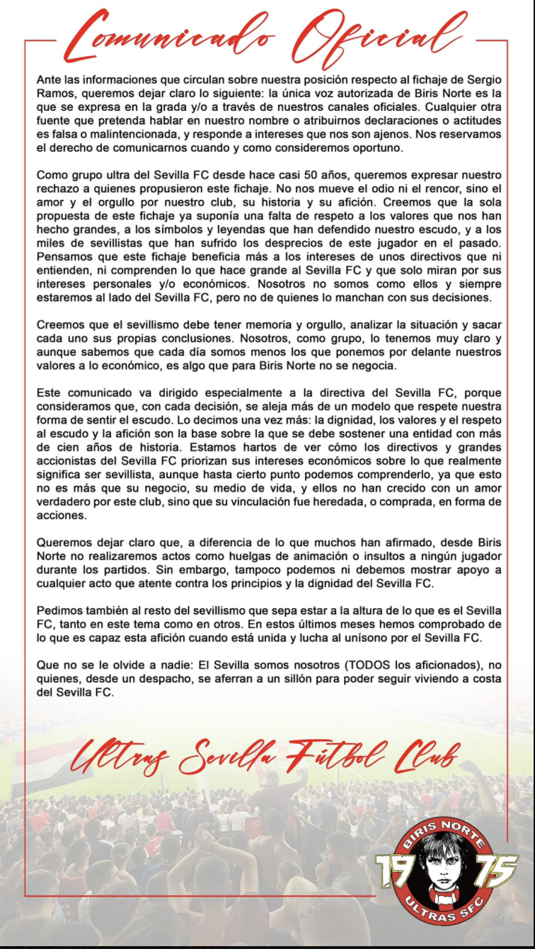 Biris Norte, grupo ultra de aficionados del Sevilla FC, ha mostrado su “rechazo” a la decisión de la Junta Directiva de fichar al defensa Sergio Ramos, que regresa a la entidad nervionense 18 años después, y ha asegurado que el sevillismo debe tener “memoria y orgullo” y hacer prevalecer los “valores” sobre “lo económico”.