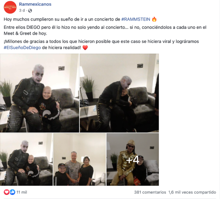 El caso de Diego fue especial y un logro comunitario. El pasado 12 de septiembre, el club de fans ‘Rammexicanos’ compartió en su página de Facebook la historia de Diego Israel, un pequeño diagnosticado con Linfoma de Hodgkin, un tipo de cáncer que ataca al sistema inmunológico, cuyo sueño era asistir al concierto en el Foro Sol y conocer a la banda.