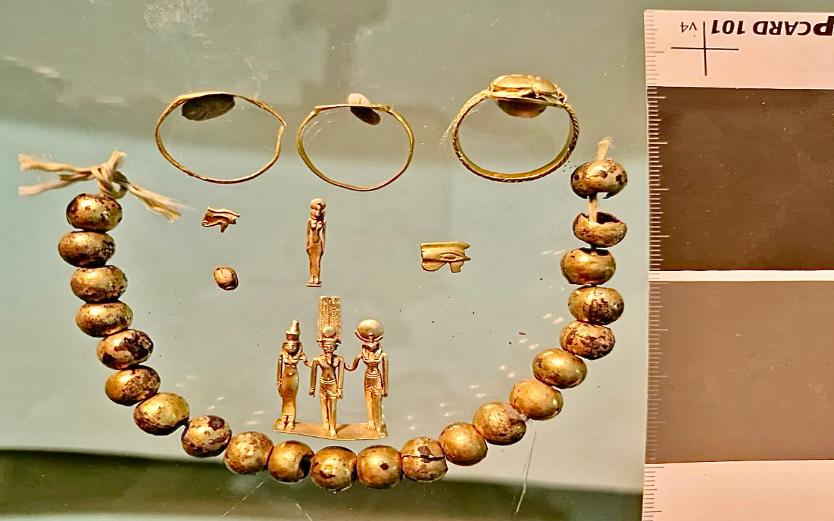 La colección de joyas incluye anillos hechos de oro y metales, pequeños amuletos de oro, incluida una estatua triple de los antiguos dioses egipcios Amón, Mut y Khonsu, además de un broche de metal, amuletos que representan a los dioses en formas de animales y una gran cantidad de cuentas, algunas de ellas chapadas en oro.
