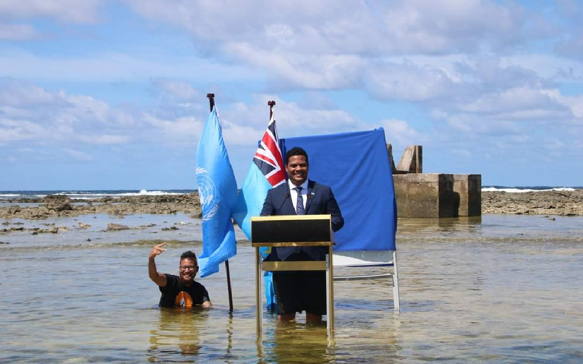 Con saco y corbata, Simón Kofe, ministro de Relaciones Exteriores de la Isla Tuvalú, un archipiélago en el corazón del Océano Pacífico, hizo un llamado a la comunidad internacional reunida en la COP26 en Glasgow para tomar conciencia sobre el aumento del nivel del mar.