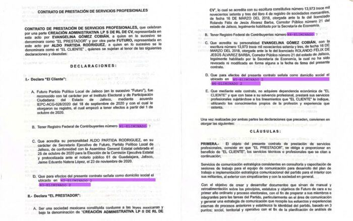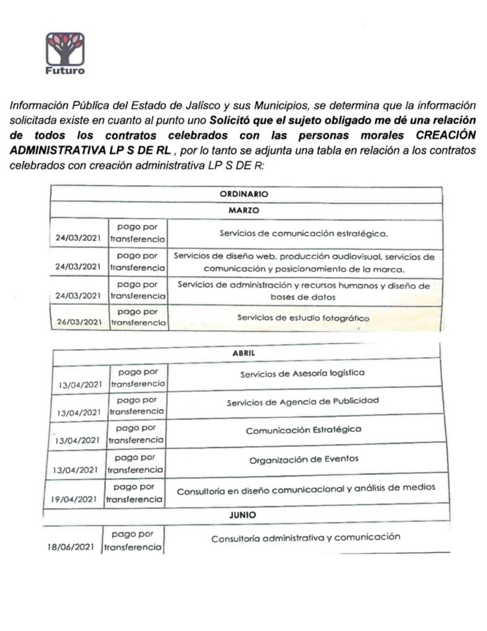 En 2021, el partido político local Futuro, con registro en Jalisco, entregó 10 contratos a Creación Administrativa LP sumando 470 mil 152.32 pesos para la adquisición de servicios con objetivos tan diversos como la creación y gestión del sitio web del partido, elaborar un manual de recomendaciones y procedimientos para llevar a cabo con medios de comunicación, despliegue de ruedas de prensa, una sesión de estudio fotográfico de dos días, desarrollar documentos que sirvan de manual sobre los principios, estatutos y objetivos de Futuro y organizar una reunión entre los comités y equipos municipales del partido con el Comité Ejecutivo.
