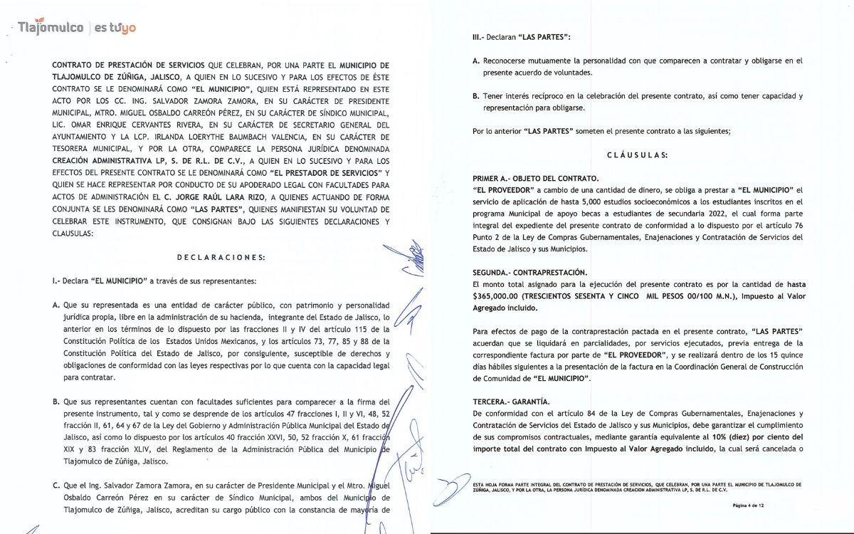 El 15 de marzo de 2022, a casi cinco meses de la entrada de Javier Castañeda a la función pública en el ayuntamiento de Guadalajara, el gobierno de Tlajomulco de Zúñiga, Jalisco, firmó un contrato por 365 mil pesos con Creación Administrativa LP para que aplicara 5 mil estudios socioeconómicos a estudiantes de secundaria para el programa de becas local.