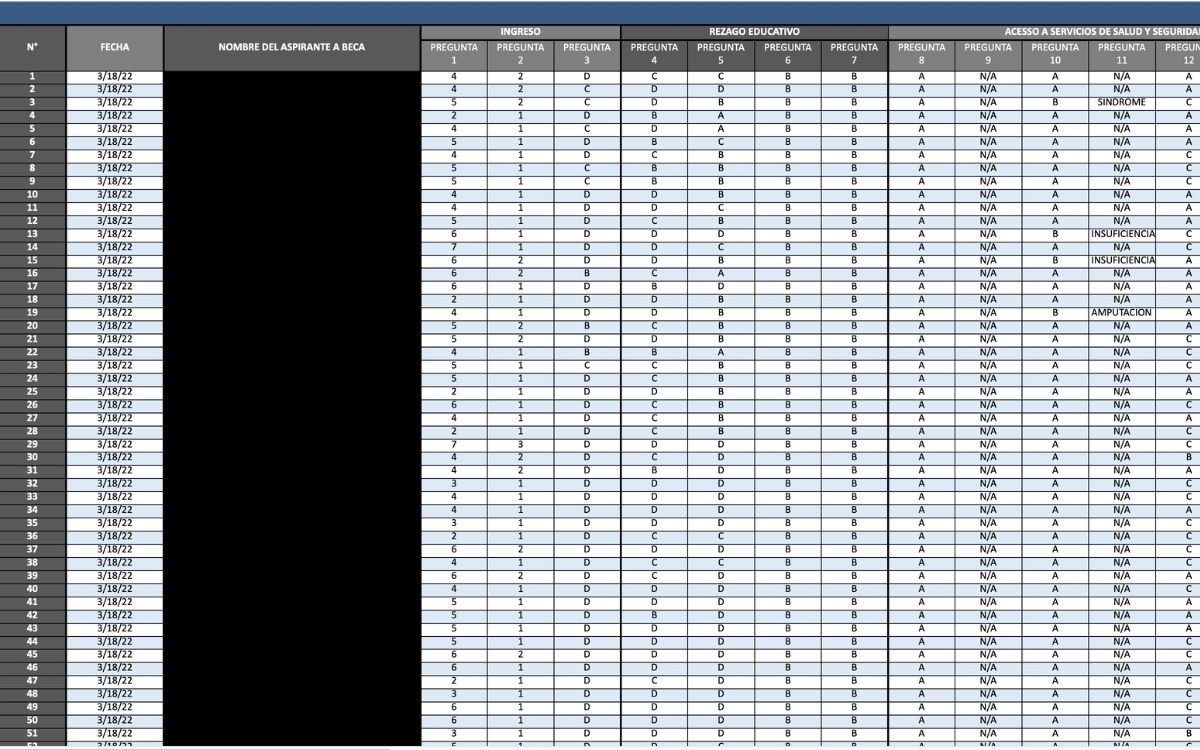 Este documento muestra los resultados de 5,319 aspirantes a becas, sin explicar la metodología empleada.