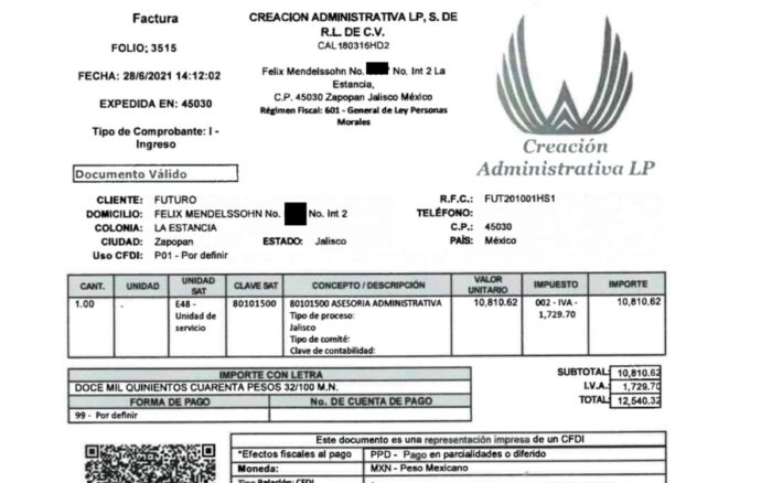 En la factura correspondiente a uno de los 10 contratos, Futuro y Creación Administrativa LP comparten el mismo domicilio fiscal: sí, el de Félix Mendelson, colonia La Estancia, Zapopan.