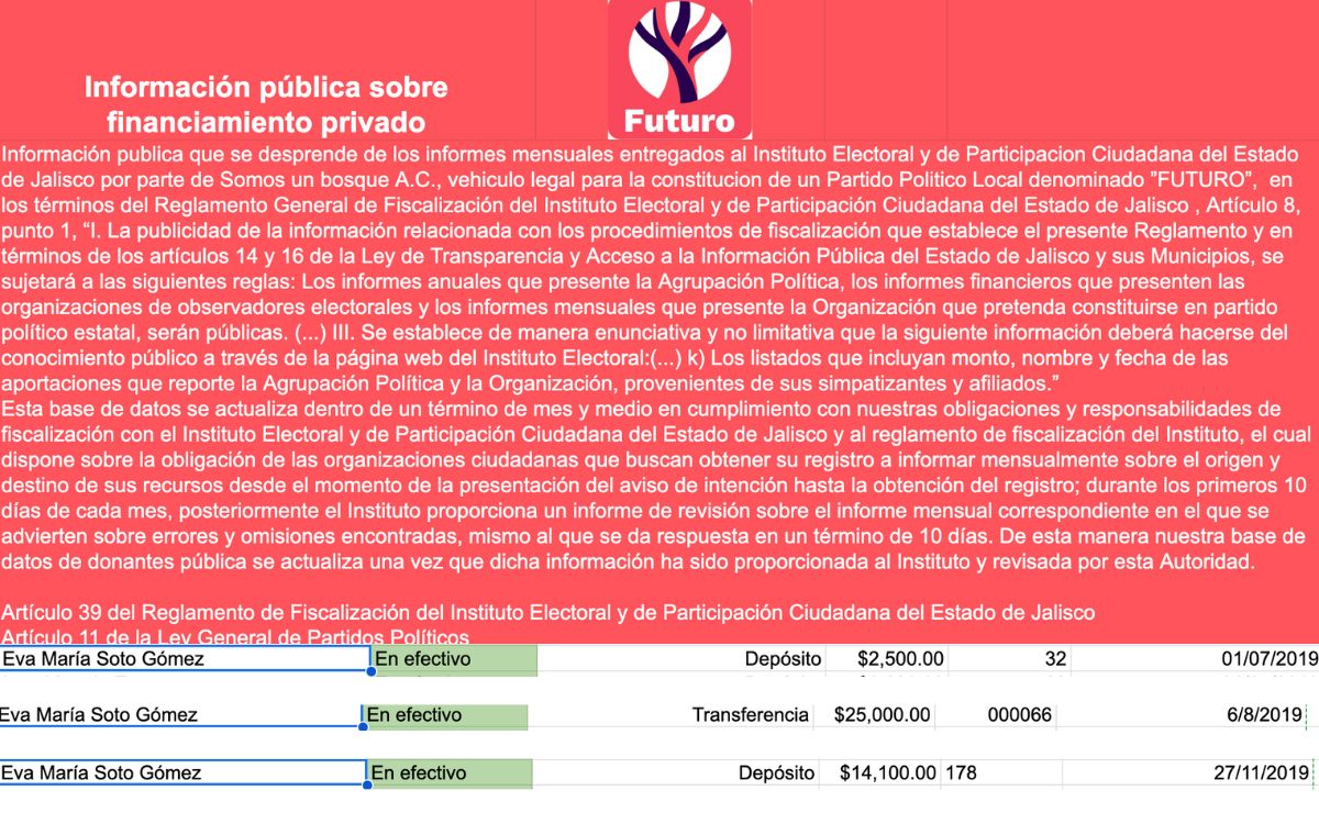 Al constituirse la empresa, Eva María Soto Gómez fue nombrada Gerente Administrativa. Un año después ella donó 41 mil 600 pesos a Futuro, según la base de datos compartida por el propio partido. En 2020, Soto Gómez aparecía como militante de Futuro en el portal de transparencia del INAI. Al siguiente año de esto, el partido le concedió casi medio millón de pesos a la empresa.
