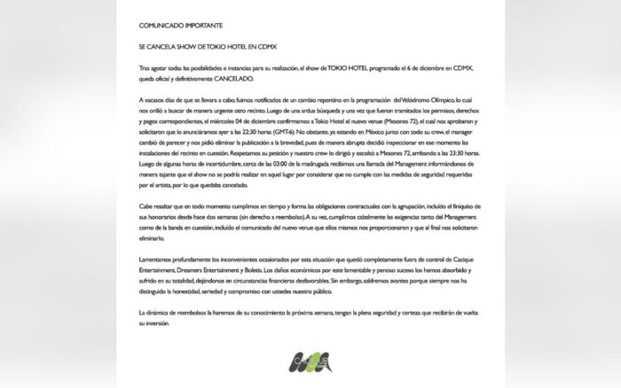 Tras la publicación de Tokio Hotel, Cacique Entertainment emitió un comunicado afirmando que la cancelación se debió a un “cambio repentino en la programación del Velódromo Olímpico“, aunado a la decisión del manager de la banda de no tocar en un recinto alternativo.