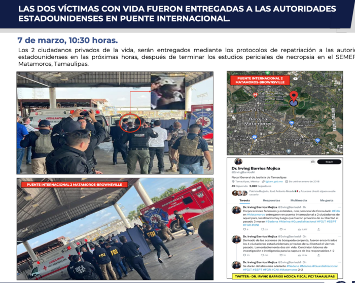 El fiscal de Tamaulipas y el gobernador confirmaron que una de las víctimas vino a México a practicarse una cirugía estética, y descartaron que alguno de ellos fuera integrante del FBI, corporación que dio a conocer la noticia del secuestro de los ciudadanos estadounidenses.