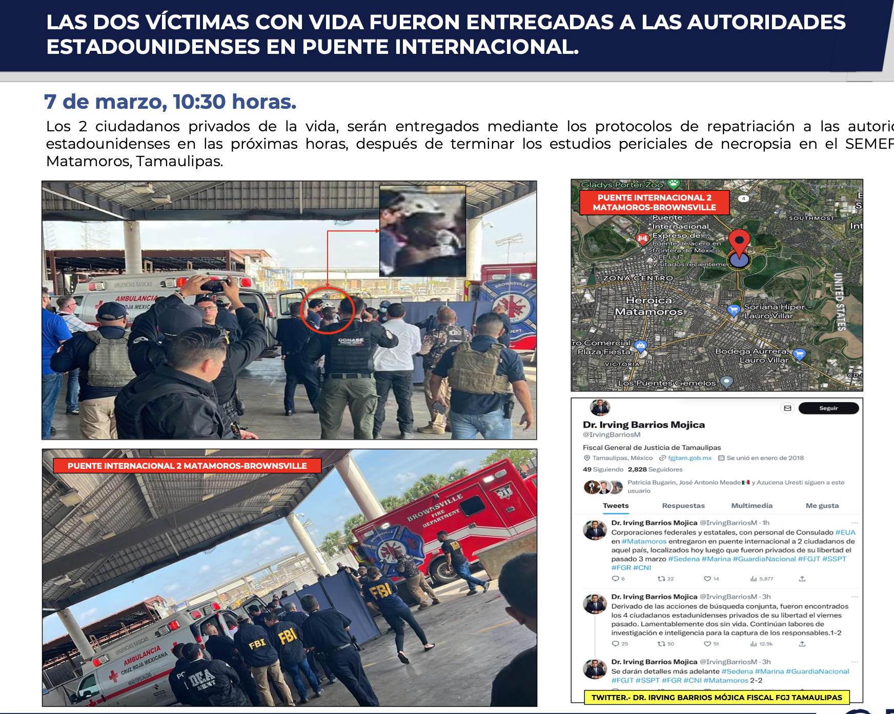 En conferencia de prensa, el gobernador Américo Villarreal y la Secretaria de Seguridad, Rosa Icela Rodríguez, junto con integrantes del gabinete de seguridad y el fiscal estatal, señalaron que todo apunta a que no se trató de una agresión directa contra los estadounidenses sino que habría sido una confusión, la cuál aún se investiga.