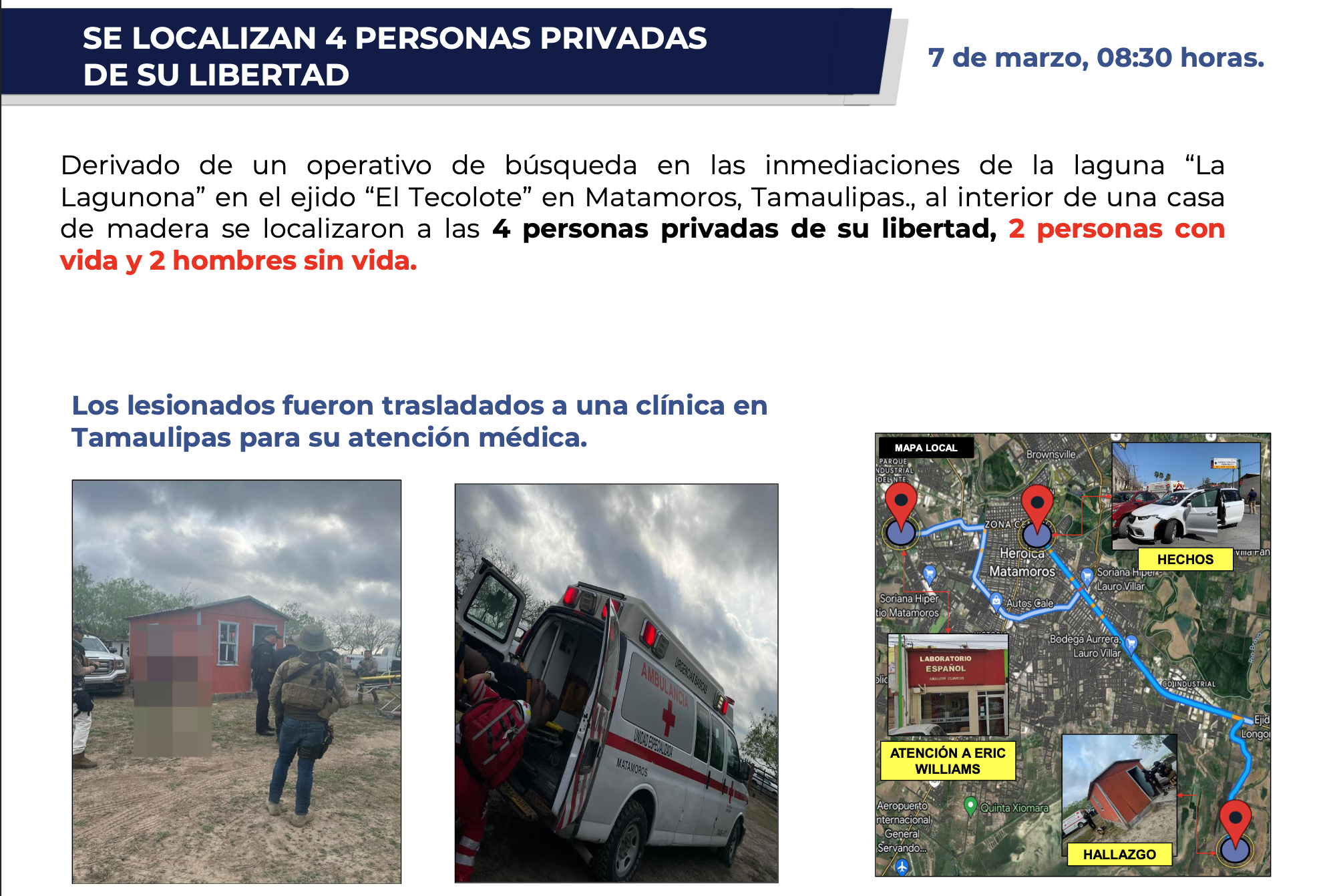 La mañana de este 7 de marzo, se localizó a las víctimas en una casa de madera en el ejido El Tecolote. Dos hombres estaban sin vida, una mujer con una herida bala en una pierna y otros más ileso. Los dos sobrevivientes fueron entregados a autoridades de Estados Unidos en un puente internacional.
