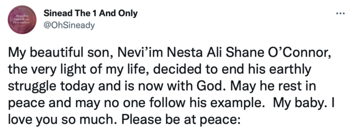 “Mi hermoso hijo, Nevi’im Nesta Ali Shane O’Connor, la luz misma de mi vida, decidió poner fin a su lucha terrenal hoy y ahora está con Dios. Que descanse en paz y que nadie siga su ejemplo. Mi bebé. Te amo tanto”.