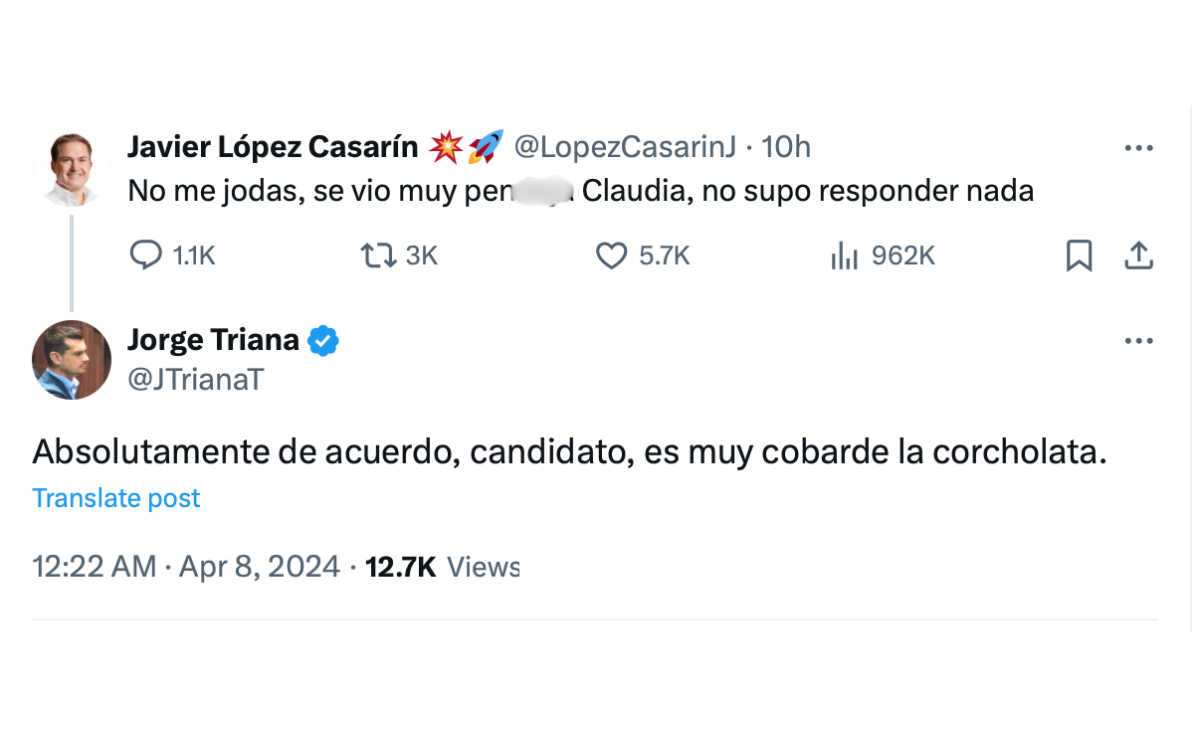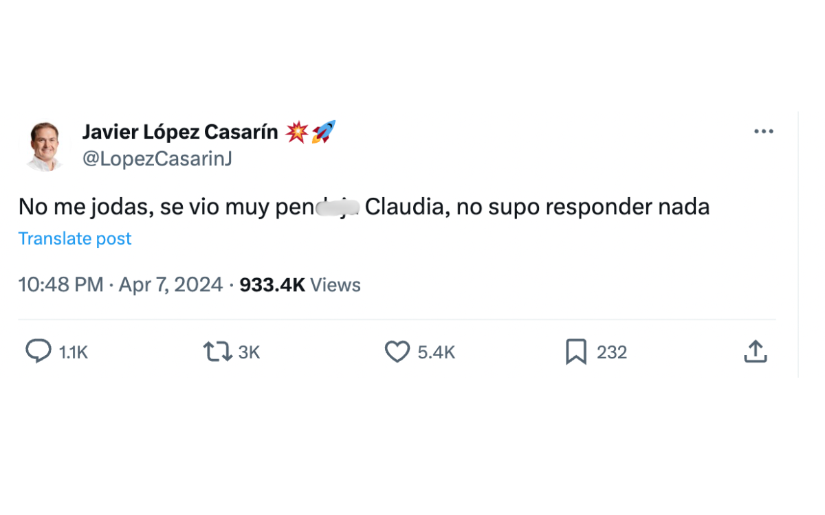 El candidato de Morena a la alcaldía Álvaro Obregón, Javier López Casarín, denunció un ataque cibernético a su perfil de 'X' en el que se publicó "No me jodas, se vio muy pend... Claudia, no supo responder nada".