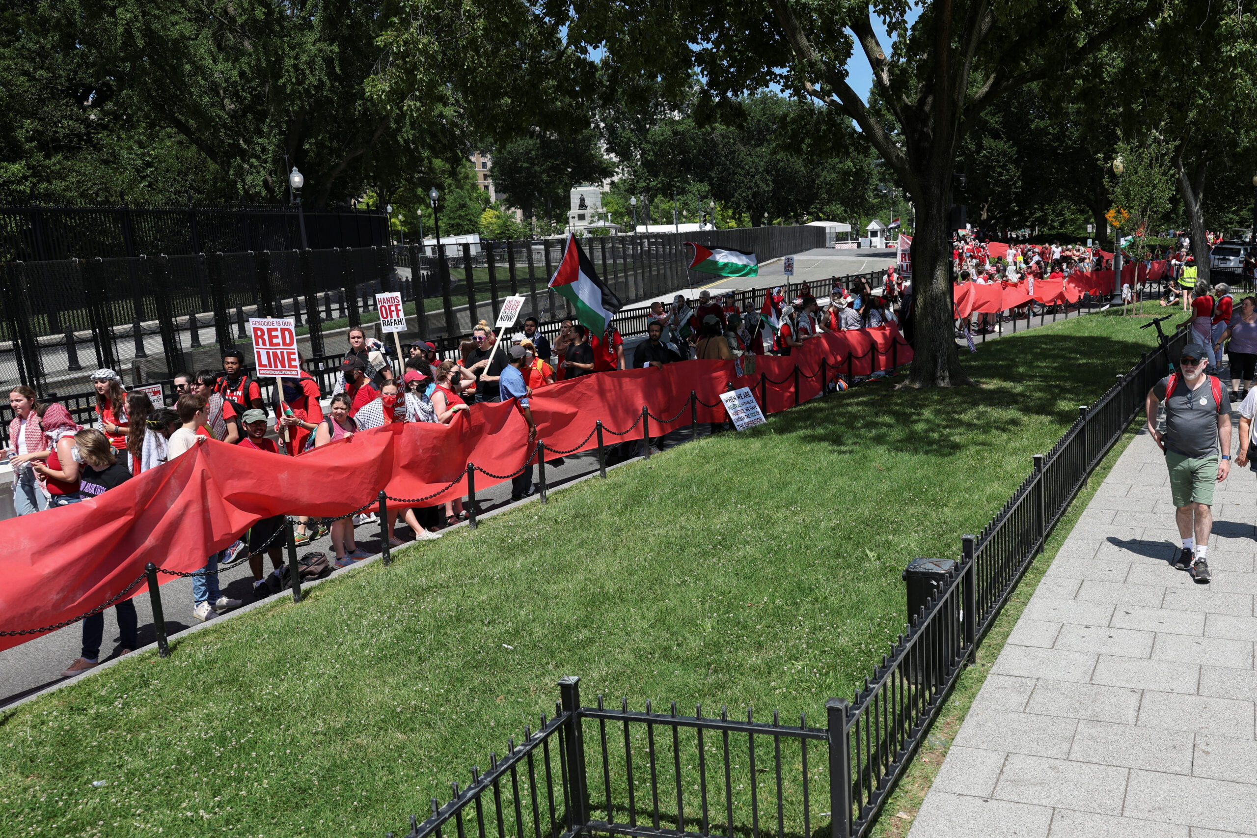 Cientos de manifestantes propalestinos rodearon la Casa Blanca con una larga pancarta roja con el lema: ‘línea roja del pueblo’, para protestar contra el apoyo de Joe Biden en el genocidio de Israel en Gaza.