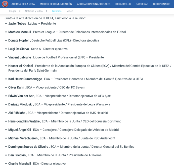 En consonancia con la unidad del futbol europeo, UEFA y las partes interesadas del futbol participantes rechazaron una vez más de forma unánime los fundamentos que sustentan proyectos como la Superliga Europea durante el debate de hoy. Los participantes tomaron nota, con sorpresa, de las afirmaciones del director general de A22 Sports de que esta empresa no representa a ningún club en ninguna capacidad, incluidos los tres clubes que siguen apoyando abiertamente el proyecto.