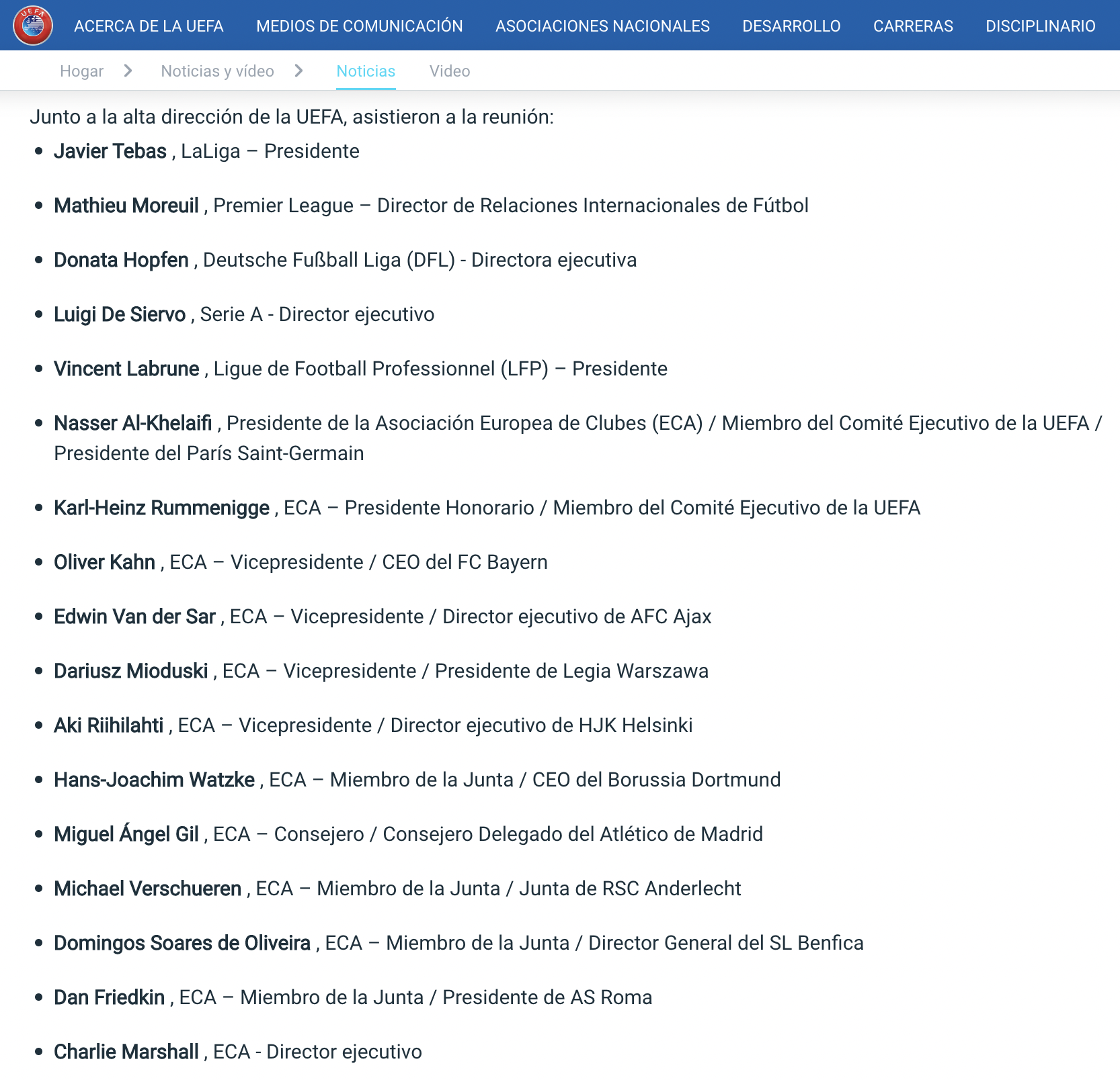 La UEFA añadió que los clubes ingleses no participaron en la reunión de este martes porque tenían previsto asistir a una reunión de accionistas de la Premier League.