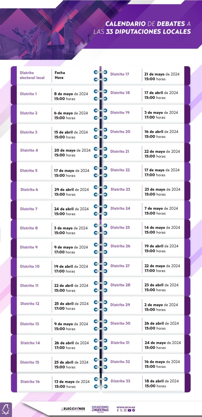 Los debates iniciarán el lunes 15 de abril y el último se llevará a cabo el viernes 24 de mayo. En total serán 51 encuentros, 16 por las alcaldías, 33 por las diputaciones locales y uno por diputación migrante.