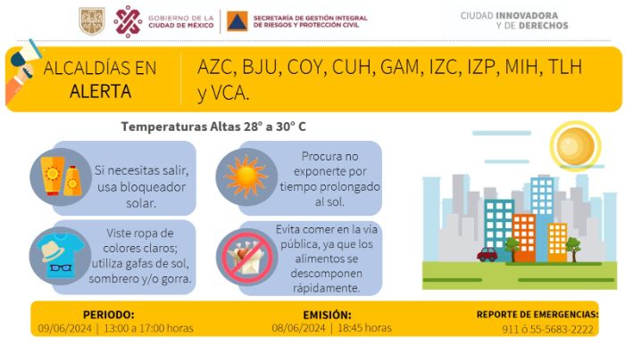 La Secretaría de Gestión Integral de Riesgos y Protección Civil (SGIRPC) de la Ciudad de México activó la Alerta Amarilla debido al pronóstico de temperaturas altas en varias zonas de la ciudad.