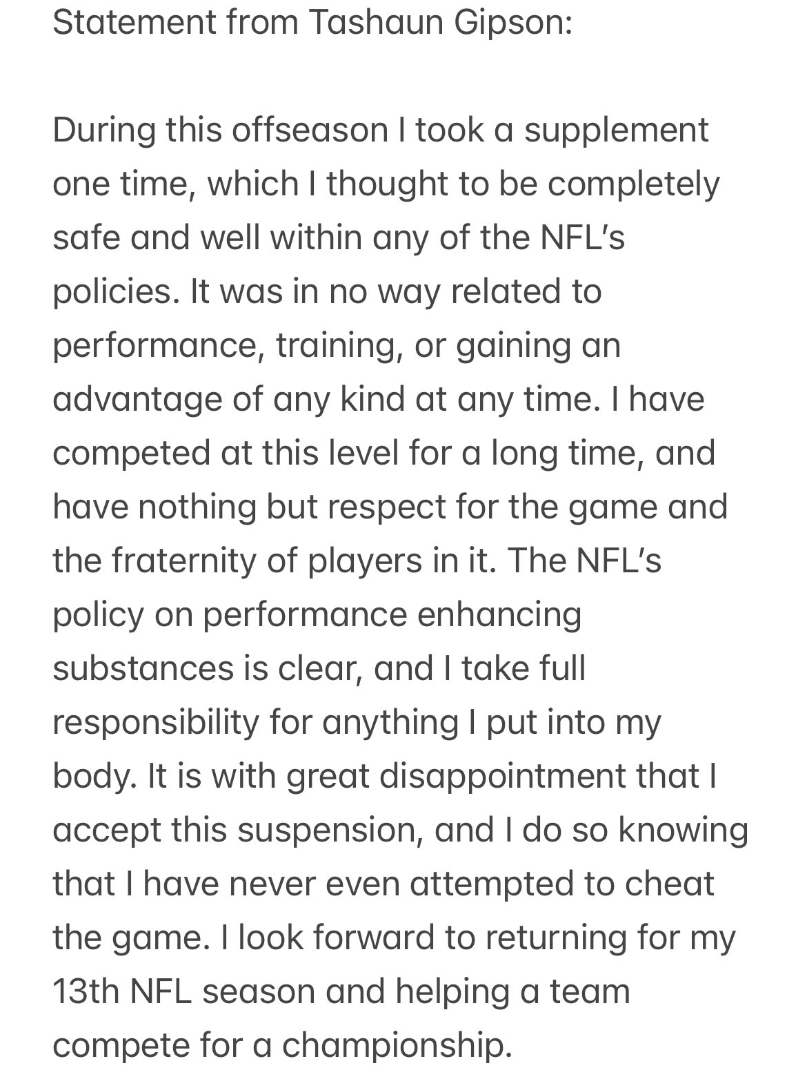 “Tomé un suplemento que pensé que era seguro y estaba dentro de las políticas de la NFL. No estaba relacionado con el rendimiento, el entrenamiento o la obtención de una ventaja de ningún tipo, pero acepto esta suspensión con gran decepción, lo hago sabiendo que nunca he intentado hacer trampa”, escribió Gipson en su comunicado.