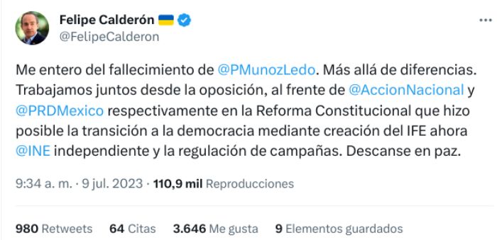 Luego de que sus familiares comunicaron la noticia a través de la cuenta oficial de Muñoz Ledo en Twitter, comenzaron a publicarse en redes las condolencias de la clase política mexicana.