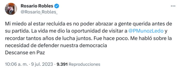 La ex secretaria de Desarrollo Social, Rosario Robles, envió sus condolencias acompañadas de un mensaje que hacía referencia al tiempo que permaneció en prisión por el caso de fraude conocido como La Estafa Maestra.