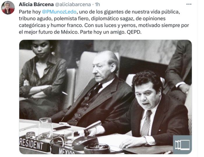 Por su parte, la secretaria de Relaciones Exteriores, Alicia Bárcena, lo recordó como “uno de los gigantes de nuestra vida pública, tribuno agudo, polemista fiero, diplomático sagaz, de opiniones categóricas y humor franco. Con sus luces y yerros, motivado siempre por el mejor futuro de México”.