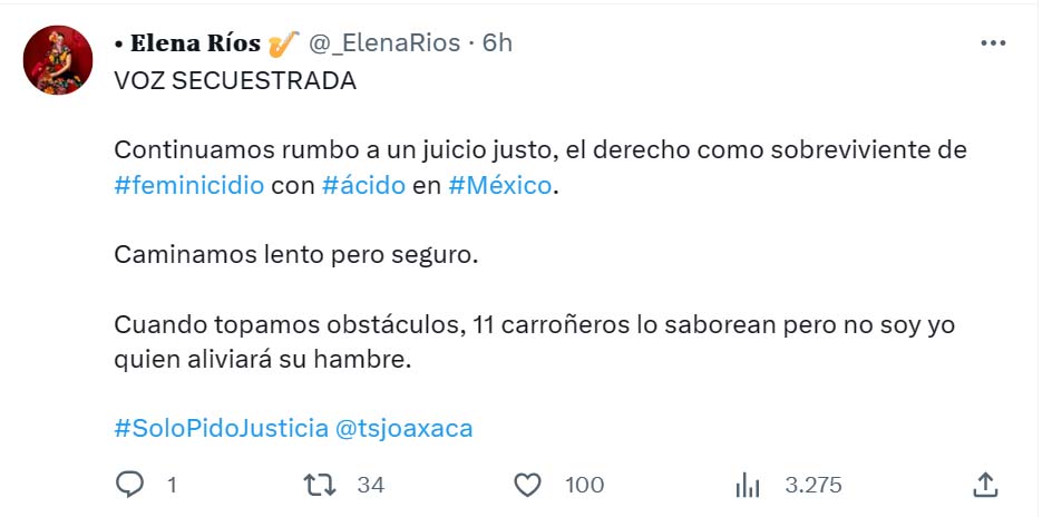 Sin mencionar detalles ni información, -aunque fuentes del Tribunal Superior de Justicia de Oaxaca (TSJO) confirman que se lleva a cabo la audiencia intermedia por el caso de María Elena Ríos, sobreviviente de tentativa de feminicidio-, la joven publicó en su red social que se continúa rumbo a un juicio justo.