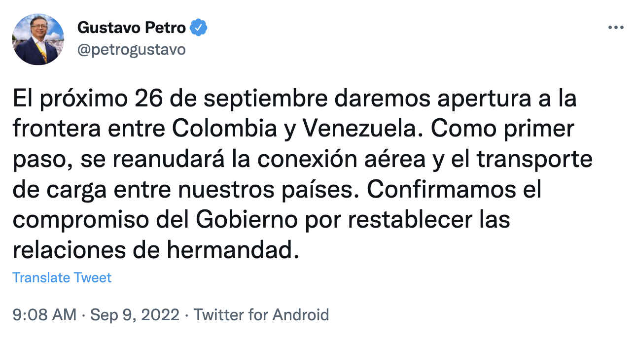 Las fronteras entre ambos países latinos, detallaron los mandatarios, en sus cuentas de Twitter, esta mañana serán abiertas el próximo 26 de septiembre. Como primer paso, dijo Gustavo Petro, “se reanudará la conexión aérea y el transporte de carga entre nuestros países”.