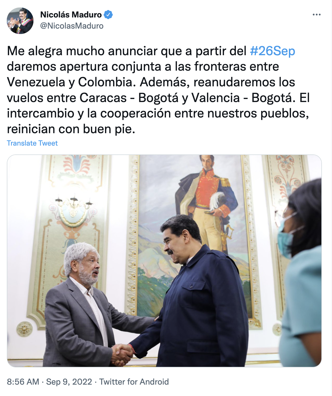 Nicolás Maduro informó por su parte, que reanudarán los vuelos entre Caracas, Bogotá y Valencia, confirmando la apertura de las fronteras entre Venezuela y Colombia. Los dos países comparten más de 2,500 kilómetros de frontera.