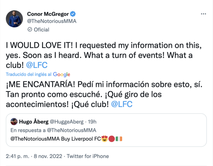 Un usuario en Twitter comentó en un de las publicaciones de McGregor ‘Compra Liverpool FC’ a lo que el irlandés respondió ‘¡Me encantaría!’.