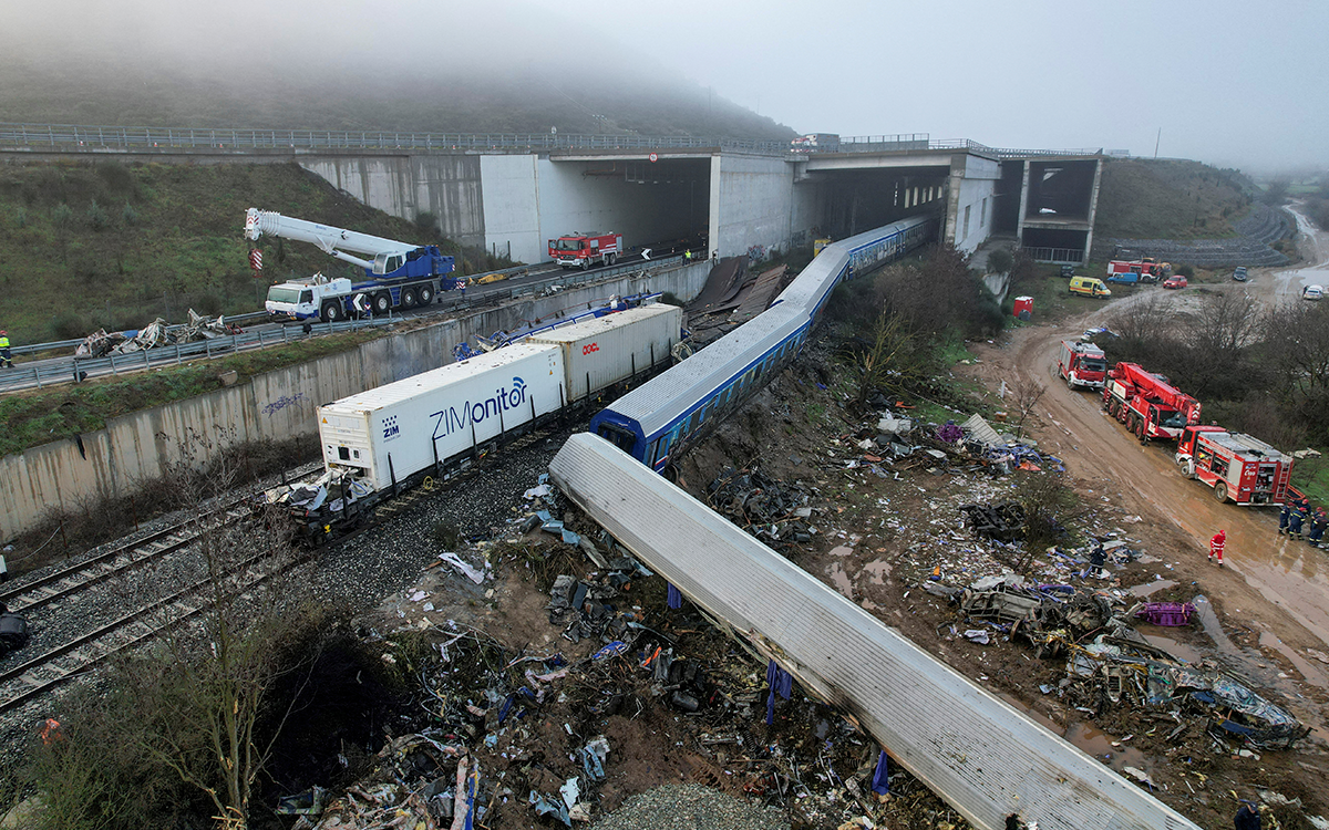 La noche del 28 de febrero un tren de pasajeros chocó frontalmente con uno de mercancías al norte de la ciudad de Larisa, y como consecuencia de la colisión, fallecieron 57 personas y varias decenas más resultaron heridas, en su mayoría jóvenes universitarios.