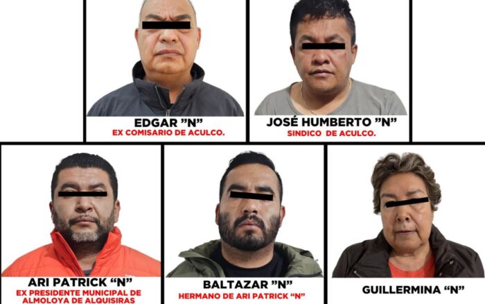 Entre los detenido están el ex presidente municipal de Almoloya de Alquisiras, Ari Patrick “N” Mondragón y su hermano Baltazar; José Humberto “N”, síndico en funciones de Aculco; Edgar “N”, ex Director de Seguridad Pública de Aculco; y Guillermina “N”, comerciante en el municipio de Almoloya de Alquisiras. Todos ellos son investigados por su probable intervención en la comisión del delito de extorsión.