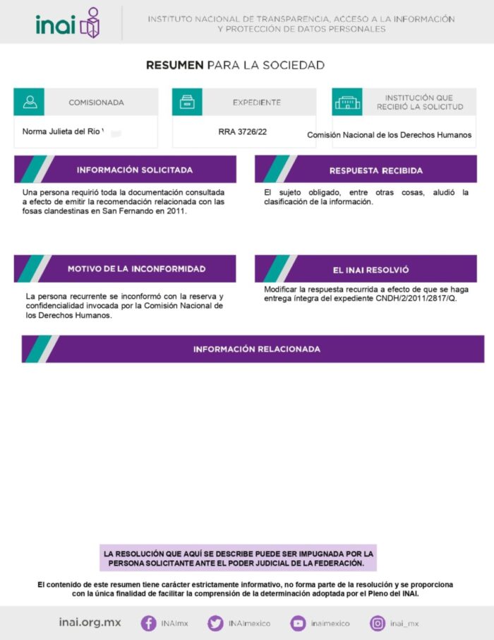 El caso se deriva de una resolución emitida por el INAI en la que ese órgano autónomo le ordenó a la CNDH proporcionar la versión íntegra de un expediente relacionado con el hallazgo de decenas de fosas clandestinas localizadas en el municipio de San Fernando, Tamaulipas, con el argumento de que se trataba de una investigación sobre violaciones graves a derechos humanos o delitos de lesa humanidad.