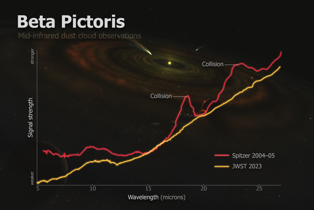 El equipo de Chen detectó cambios significativos en las firmas de energía emitidas por los granos de polvo alrededor de Beta Pictoris al comparar nuevos datos del Telescopio Espacial James Webb con observaciones del Telescopio Espacial Spitzer de 2004 y 2005.