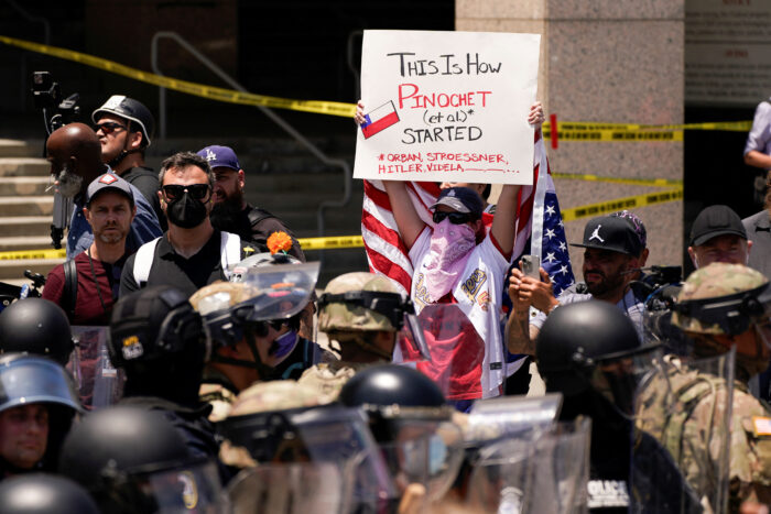 “Ahora, turbas violentas e insurrectas pululan y atacan a nuestros agentes federales para intentar detener nuestras deportaciones”, continúa narrando el video, mientras de fondo se aprecia la imagen de los Stormtroopers o Tropas de Asalto del universo ficticio Star Wars.