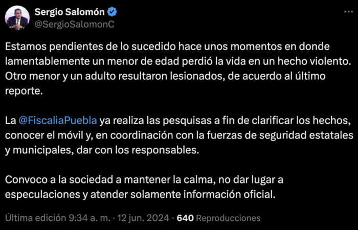 Salomón también reveló que la Fiscalía de Puebla “ya realiza las pesquisas a fin de clarificar los hechos, conocer el móvil y, en coordinación con la fuerzas de seguridad estatales y municipales, dar con los responsables”.