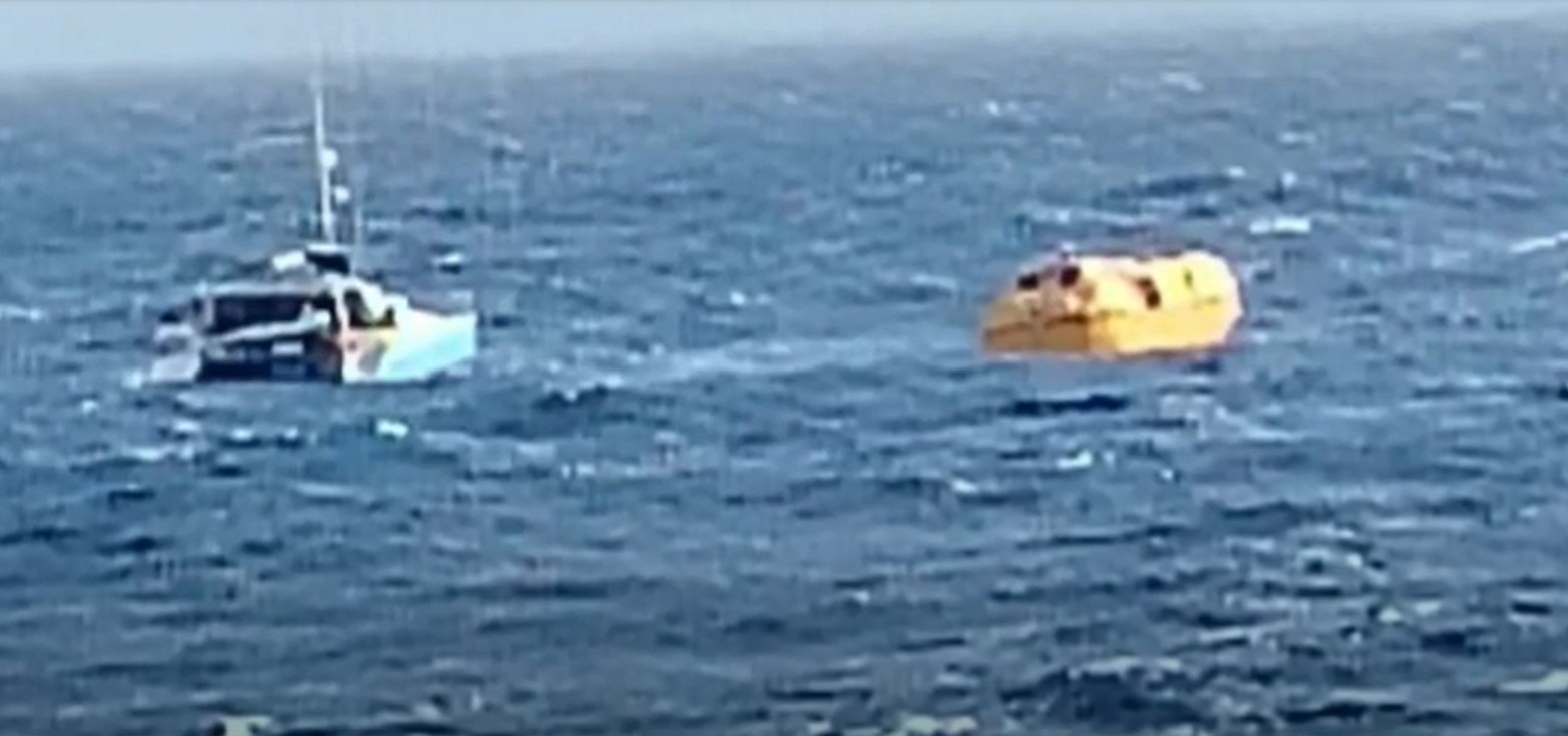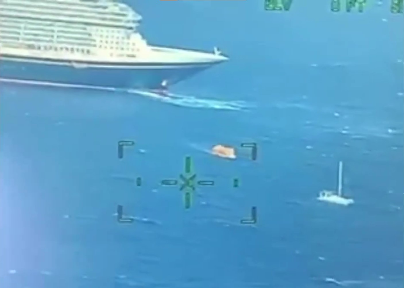 Un vídeo de la Guardia Costera publicado en las redes muestra el bote salvavidas amarillo dirigiéndose desde el crucero hacia el catamarán averiado.