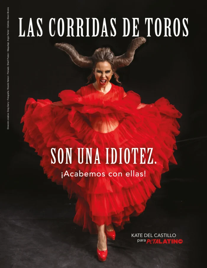 En la campaña, con la que PETA Latino busca hacer conciencia, se ve a la protagonista de ‘La Reina del Sur’, Kate del Castillo, con el cabello retorcido en forma de cuernos, gritando y con un vestido rojo que, según la organización, representa la ira de una mayoría de ciudadanos por la reanudación de las corridas de toros.