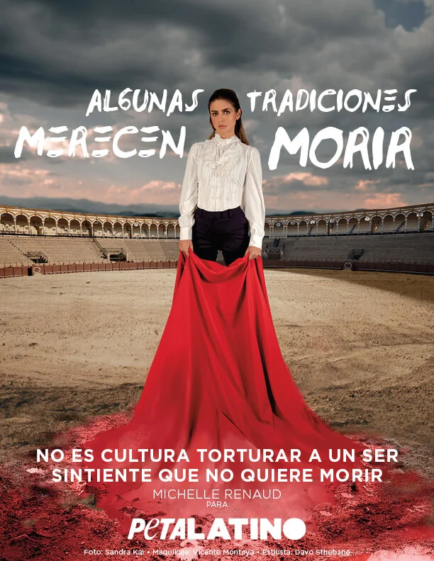 En otras de las imágenes se ve a Michelle Renaud con un capote ‘ensangrentado’ y el mensaje “algunas tradiciones merecen morir”.