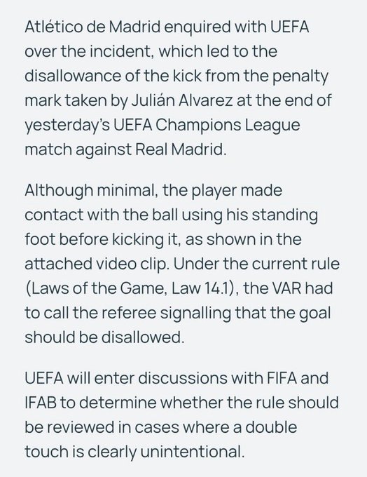 UEFA informó igualmente que el Atlético de Madrid le “consultó” sobre esta jugada y que aprovechará la polémica suscitada para “entablar conversaciones con la FIFA y el IFAB (el organismo que rige las normas internacionales del futbol) para determinar si la regla debe revisarse en los casos en que un doble toque sea claramente involuntario”.