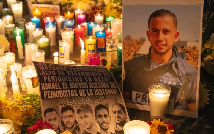 “¡Los periodistas en Gaza, no son una amenaza, los niños en Gaza, no son una amenaza!”, gritaron los manifestantes, quienes se reunieron en el Ángel de la Independencia, en la céntrica avenida Reforma, para realizar una vigilia por los periodistas asesinados en la que decenas de asistentes portaron veladoras y flores.